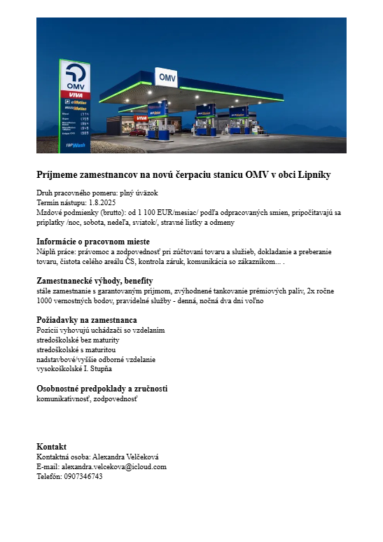 Ponuka práce -  Lipníky  čerpacia stanica OMV 1